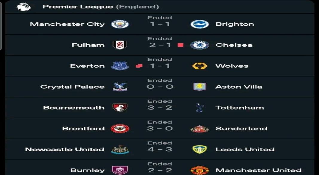 EPL: In what was his last game for Antoine Semenyo fr Bournemouth, he scored the 95th minute winner as Bournemouth beat Tottenham 3-2. Goals from Evanilson and Kroupi were canceled by goals from Mathys Tel and Joao Palhinha. A brace from Igor Thiago and Yehir Yamoliuk halpee give Brentford a 3-0 win over Sunderland which moves them to 5th ahead of both Manchester United and Chelsea who lost 2-1 to Fulham. Raul Jimenez gave Fulham the lead in the 53rd minute before Liam Delap equalized, Harry Wilson scored the winner to continue his exceptional form for Fulham this season. Crystal Palace played out a drab 0-0 draw against Aston Villa while Everton played out 1-1 draw against Wolves. Micheal Keane gave the Toffees the lead before getting sent off. 18 years old Portuguese winger Matheus Mane continued his fine form since joining the starting 11 by equalizing before Jack Grealish was sent off in the 90th minute. Manchester City lost further points in their chase of league leaders Arsenal as they were held to a 1-2 draw by Brighton.
